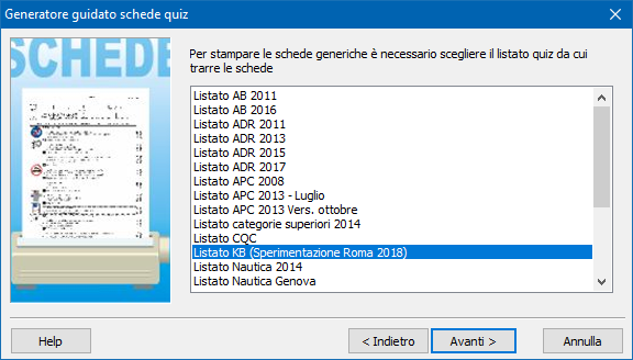 Si apre la maschera per la procedura guidata di generazione delle schede quiz. Cliccare su avanti e scegliere le schede da stampare.